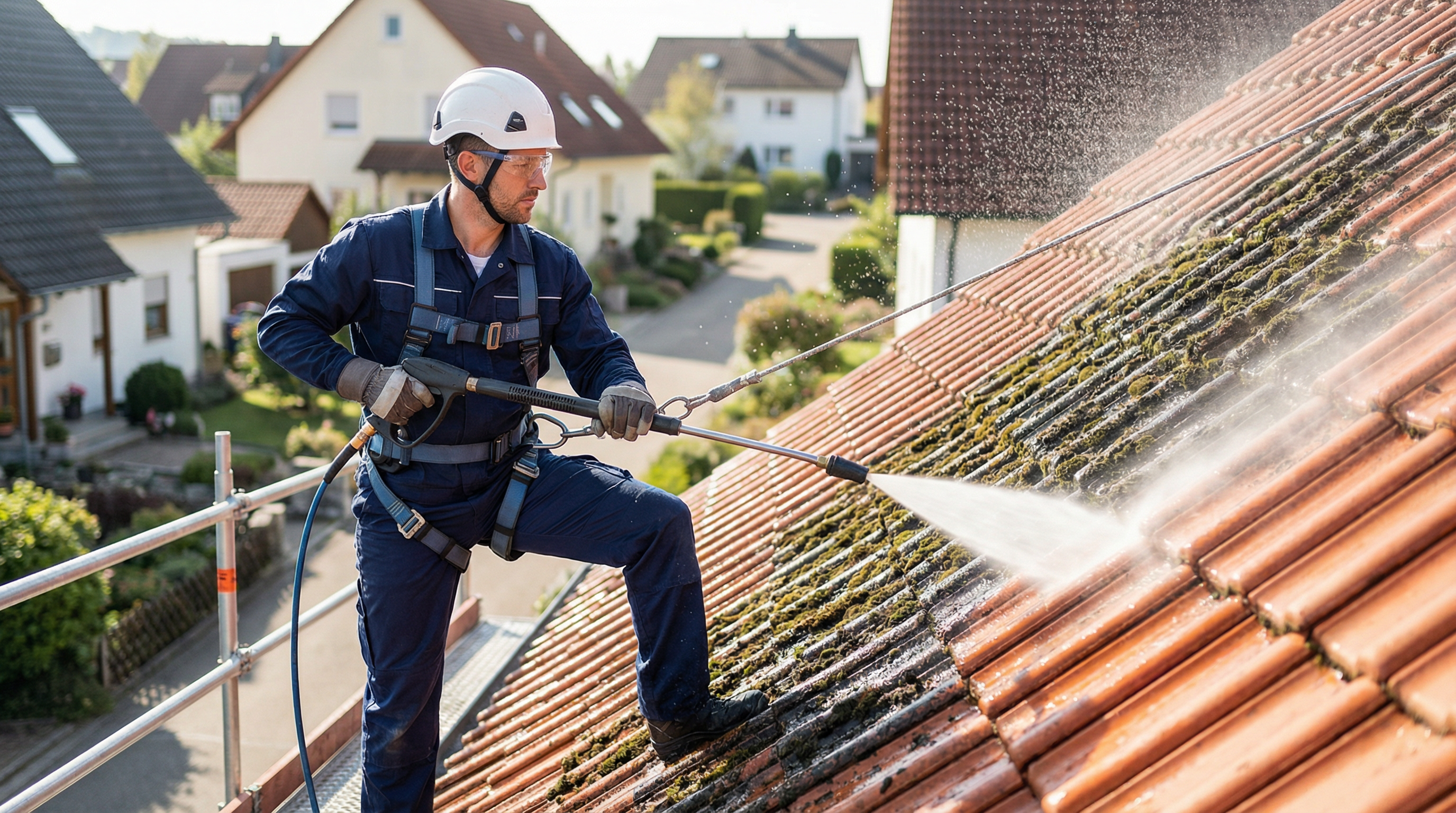 Professionelle Hochdruckreinigung mit materialabhängig reguliertem Druck. Unsere geschulten Fachkräfte entfernen Moos, Algen und Verschmutzungen schonend und effektiv – ohne Beschädigung Ihrer Dachziegel.